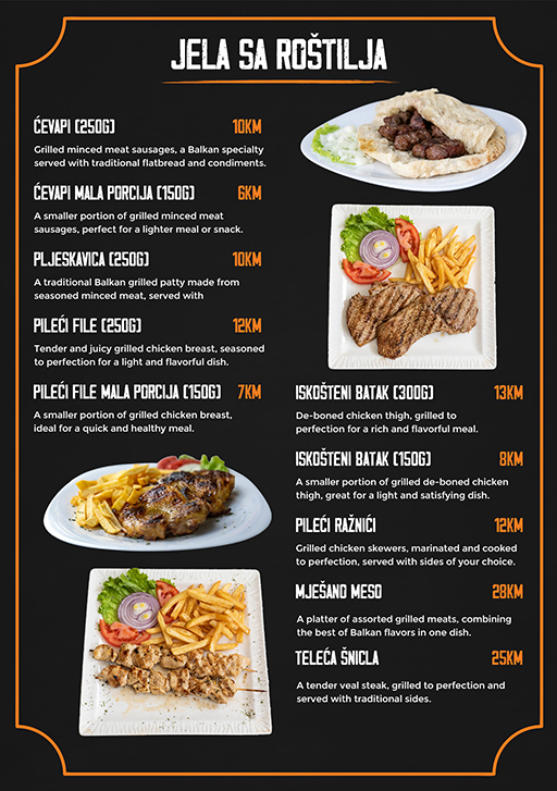 I independently worked on graphic design for Pečenjara Bešić, creating the menu design, food catalog, and pricing materials.